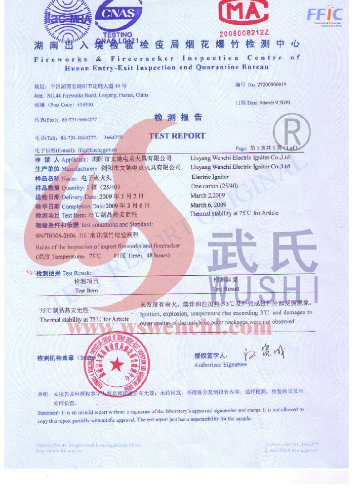 瀏陽市文馳電點火具有限公司(原培文電子點火器材廠),創建于1998年,是一家專業從事研制銷售電子點火產品的民營科技企業,是我國第1枚煙花用電點火頭生產者,是《煙花爆竹電點火頭國標》牽頭起草單位。公司位于中國“煙花之鄉”湖南省瀏陽市,地理位置優越,交通便利。    我公司研制的對象是用電能引燃火藥、做機械功等預定功能的一次性使用的元件或裝置,包括電點火頭(英文名ElectricMatch or Electric Igniter,中文俗稱“電火柴”或“電發火頭”)、電點火管和延期電點火管;我們估且在以后的產品技術欄中將我們研究的產品統稱為電點火具,將電點火器看成是用于提供和控制供給電點火元件點火的電能器材;我們研究的電點火橋路有橋絲式、無橋絲···